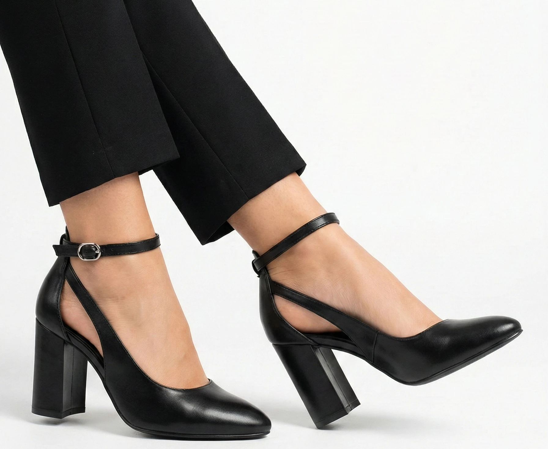 Обувки Eliza са елегантен модел обувки, изработени от висококачествена еко кожа в черен цвят. Те са изчистени и стилни, подходящи за различни поводи и събития. Закопчаването е много лесно с токата с прехвърляне. Каишката много добре обхваща и придържа крака. Изключително удобни и леки за носене, обувките Eliza се отличават с висок ток, който добавя женственост и елегантност на визията. Дизайнът на обувките Eliza е съчетание на класика и модерност, което ги прави подходящи както за официални събития, така и за ежедневна употреба. Изработени с внимание към детайлите и с високо качество на материалите, тези обувки ще подчертаят индивидуалността и стилът на всеки, който ги притежава. Обувките Eliza са идеален избор за жени, които ценят комфорта, качеството и елегантността в едно. С тях ще се чувствате уверени и стилни във всяка обстановка. Височина на тока - 8,5см.
