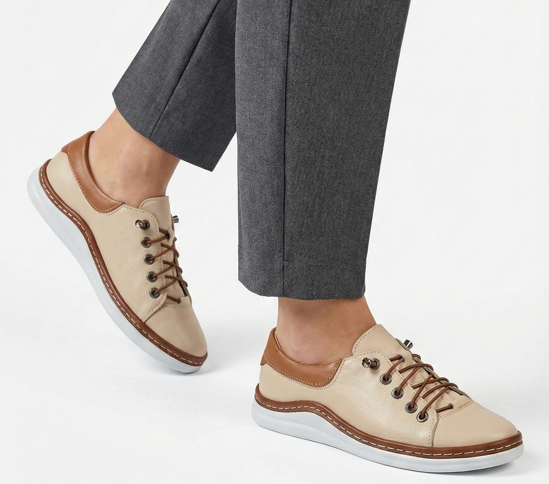 Обувките са изработени от висококачествена естествена кожа в светло бежов цвят, като допълнителен акцент имат кафяви детайли. Моделът е с удобна подметка и връзки, които осигуряват стабилност и комфорт при носене. Дизайнът е класически, но в същото време стилен и модерен, подходящ за всякакви поводи. Обувките се отличават с високо качество на изработка и материали, което ги прави издръжливи и устойчиви на всякакви условия. Съчетанието на светло бежов и кафяв цвят придава на обувките елегантност и изисканост, които ги правят подходящи както за специални събития, така и за ежедневна употреба. Независимо дали ги комбинирате с дънки, панталони или пола, тези обувки ще допълнят перфектно вашия тоалет и ще придадат завършен вид на вашия стил.