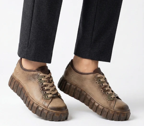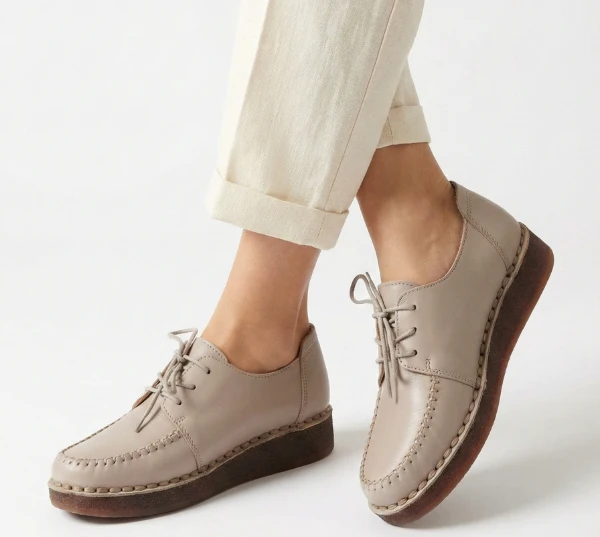 Дамски обувки MatStar тъмно бежови от естествена кожа с шев, с връзки